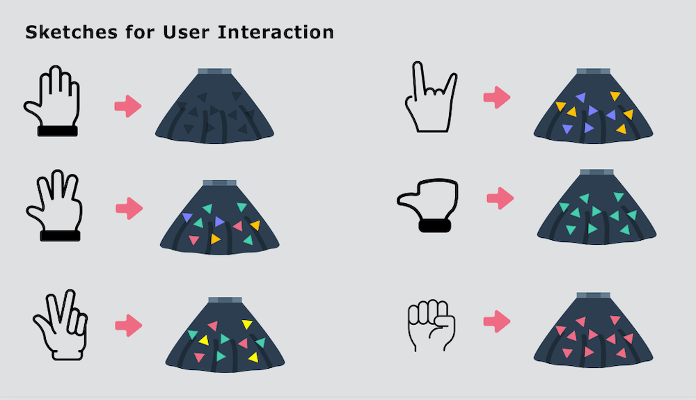 This project is called "Inner Voice" which is an e-textile project consisting of a glove connected to a bracelet as a signal sender, 8 pieces of light modules in tetrahedron shapes installed on a dress and a belt as a signal receiver. With "Inner Voice", we can express self-conscious emotions in a more polite way without ruining others’ moods whether in a party or a public space simply by using different kinds of hand gestures to light up various patterns remotely. For this project, I replaced all the jumper wires and breadboards with conductive fabrics, yarns and self-made PCB shields to make everything in order.