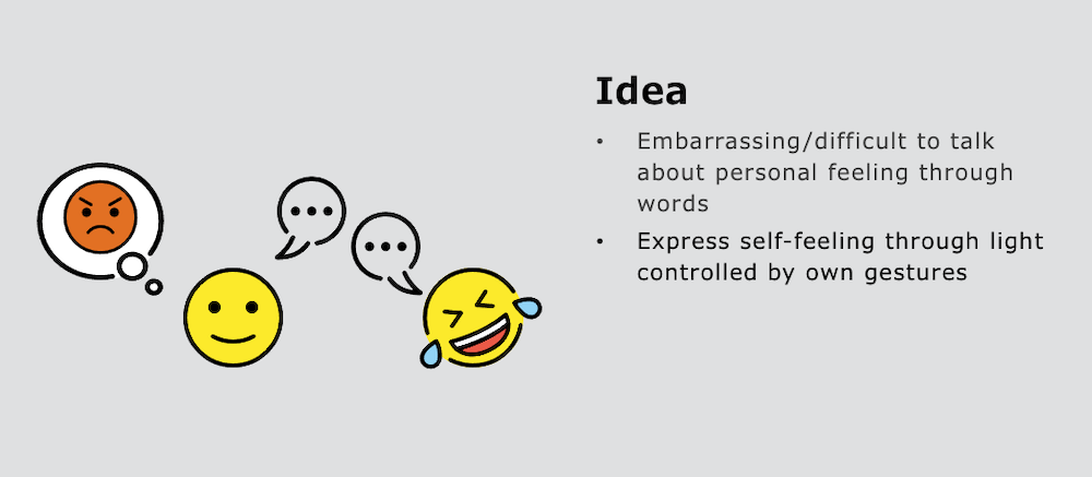 Sometimes there is a situation that it is embarrassing or difficult to talk about personal feelings through plain words during a conversation. Is there any way to inform others about self discomfort without offending them? According to this, I came up with an idea that is it possible to express ourselves through light controlled by our gestures?